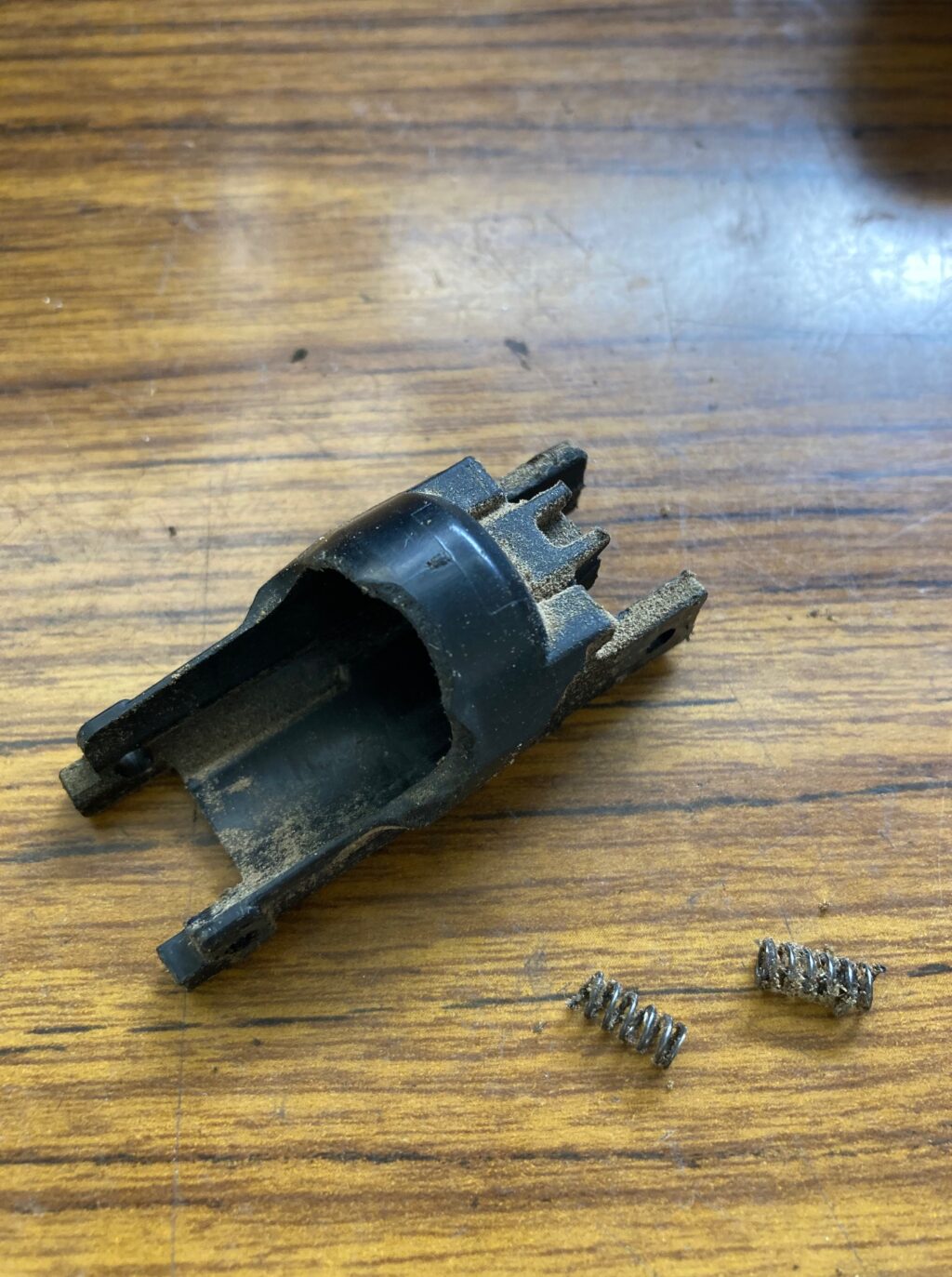 ノーズの破損で持ち込まれました。交換するのに必要な箇所を分解し交換していきますが、バンパとトリガ部分の一部破損があり、一緒に交換しました。問題なく完成と思われましたが、納品後、連発打ちはできるが単発打ちができないと連絡がありました。連発打ちだけ確認にしていたのがいけなかったのですが、トリガの中にあるプッシュレバーの取付が、上下が間違っていたことが原因でした。反省です、お客様には迷惑をお掛けしたのですが、次につながる経験でした。