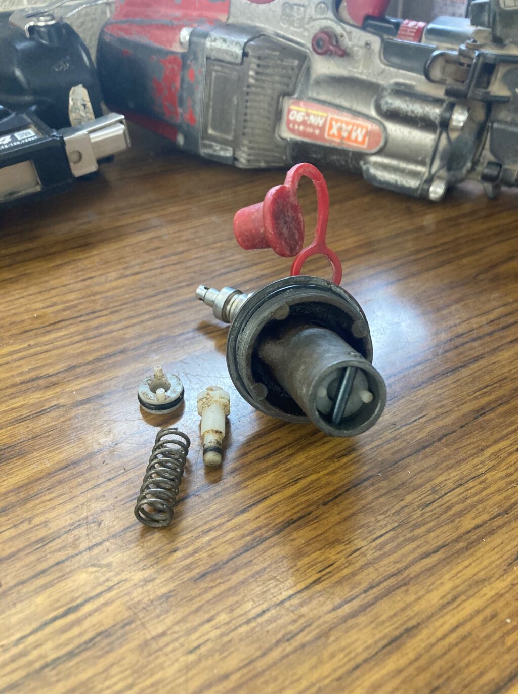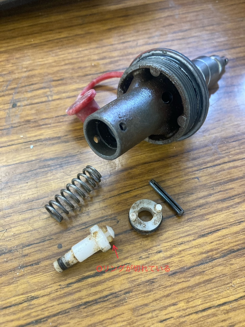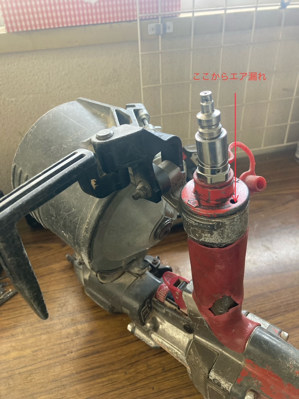このモデルはアフターサービス終了の機種で、メーカー修理は送っても修理しないで返却されます。以前から何度も修理は自社にて対応はしていますが、もうダメかもが何度も続きながら修理してきました。今回はカプラ横からのエア漏れで、エンドキャップの不良です。この型番では部品検索できませんが、他の型番の釘打機と共通なので今回も無事、修理することができました。お渡し時に今回が最後でしょうとは言っていますが、どうなるか分かりません。このようなアフターサービス終了機種の修理をする記事を見て問い合わせがありますが、基本的に当社で購入して頂いている方、限定での修理になります。