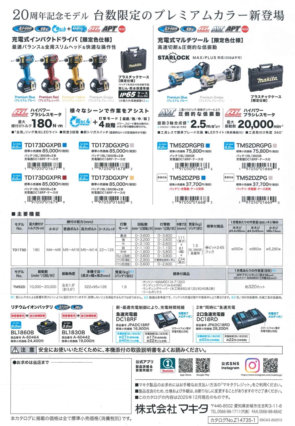 限定品✨マキタ 20th Anniversary 投稿者 tominagakanamonohanbaibu投稿日:2025年12月15日2025年12月15日限定品✨マキタ 充電式インパクトドライバ・マルチツール プレミアムカラーが発売されました!プロ向け電動工具業界初、リチウムイオンバッテリを採用した充電工具の発売から20年を記念して限定色が発売されました!