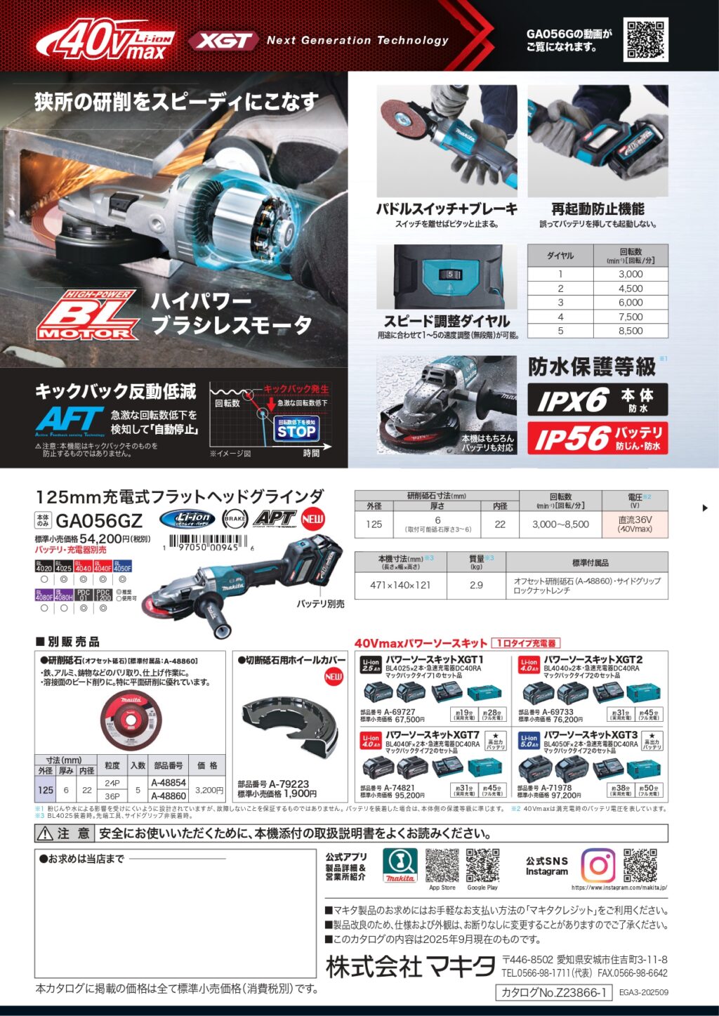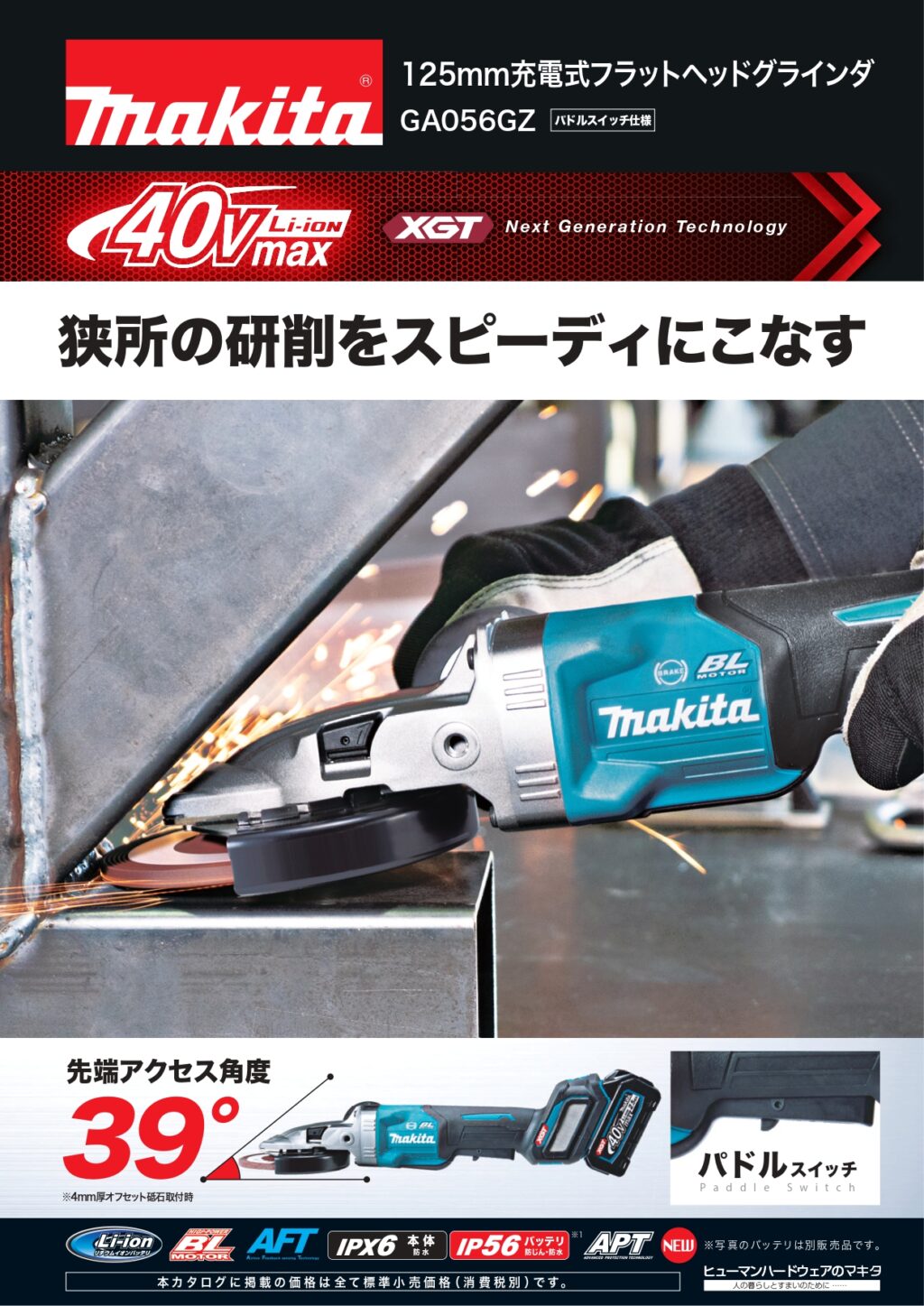 🆕マキタ 充電式フラットヘッドグラインダ 投稿者 tominagakanamonohanbaibu投稿日:2025年10月6日2025年9月30日マキタ 40Vmax 125mm充電式フラットヘッドグラインダ GA056Gが発売されました!先端アクセス角度39°✨✨通常のディスクグラインダでは作業が難しい狭所でも快適な研削が可能👍※4mm厚オフセット砥石取付時